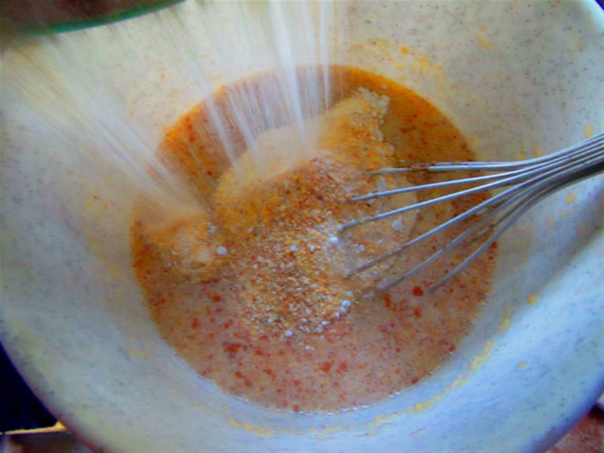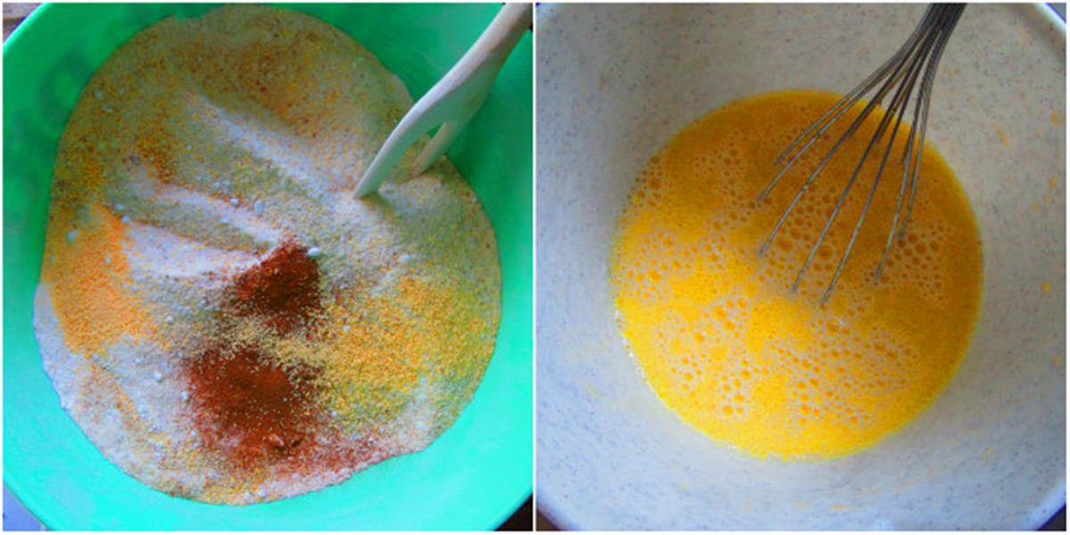Palentu, brašno, krušne mrvice, šećer, cimet, ribanu koricu naranče i limuna i sol pomiješati u jednoj posudi, a jaja, mlijeko, med i maslinovo ulje u drugoj.