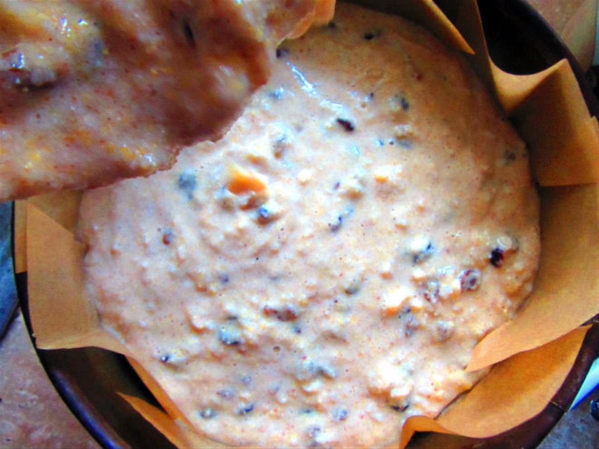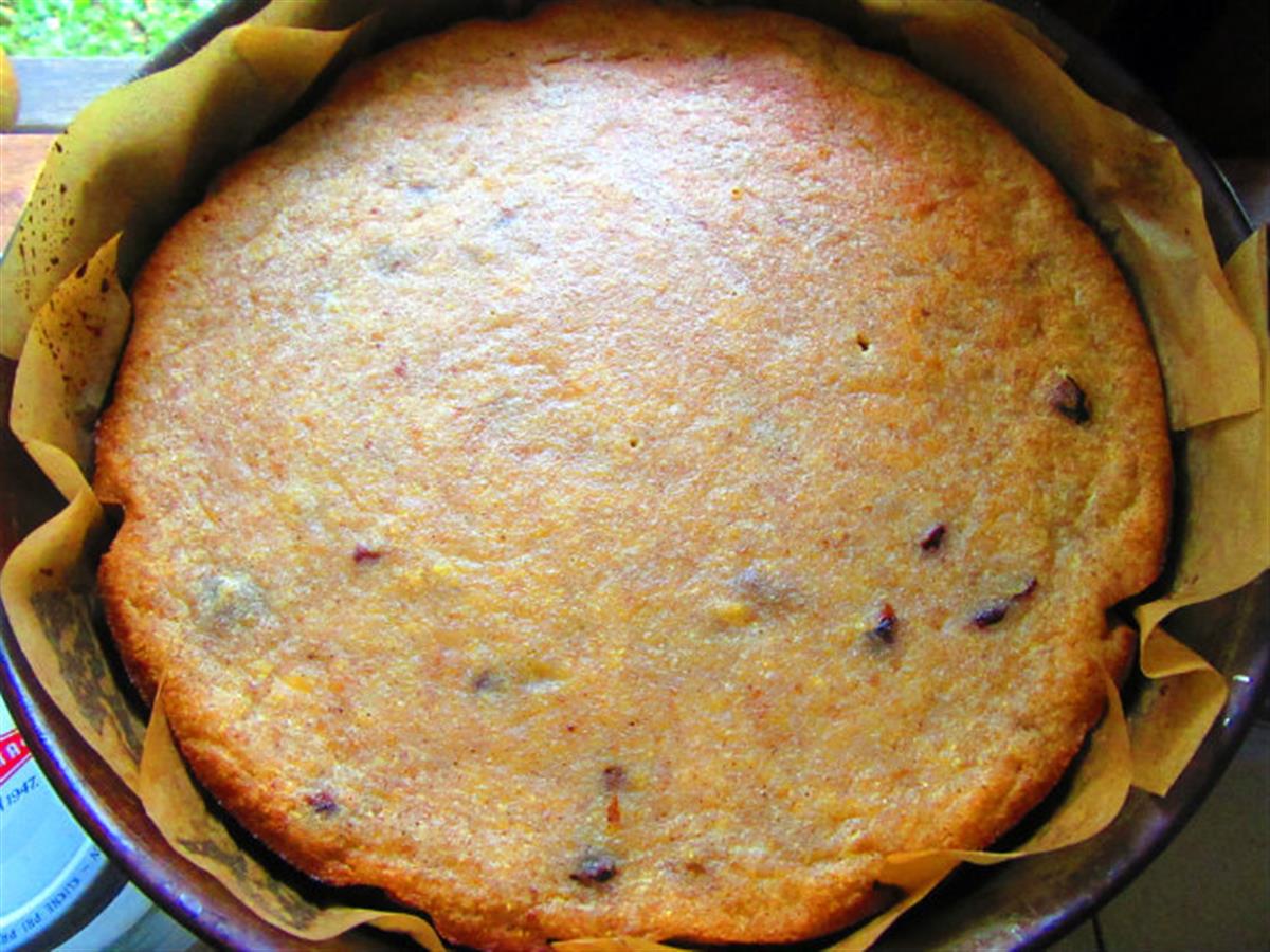 Smjesu uliti u papirom za pečenje obložen oblik za pečenje s pomičnim stranicama, promjera 26 cm. Peči u pećnici oko 50 minuta na 180ºC, uz povremeno nadgledanje pečenja – ako kolač počinje dobivati jaču smeđu boju oko rubova, najbolje ga je prekriti folijom i nastaviti s pečenjem.