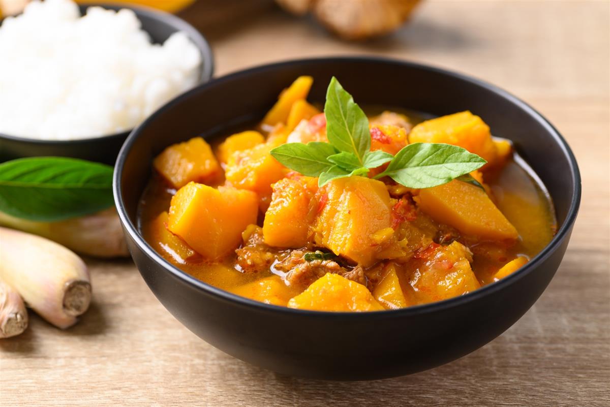 U velikom loncu zagrijte 2 žlice masti. Dodajte meso i kratko ga popržite. Zatim dodajte mrkvu, bundevu i krumpir. Začinite Vegetom, paprom, češnjakom u prahu i prstohvatom đumbira. Pirjajte 5–6 minuta.