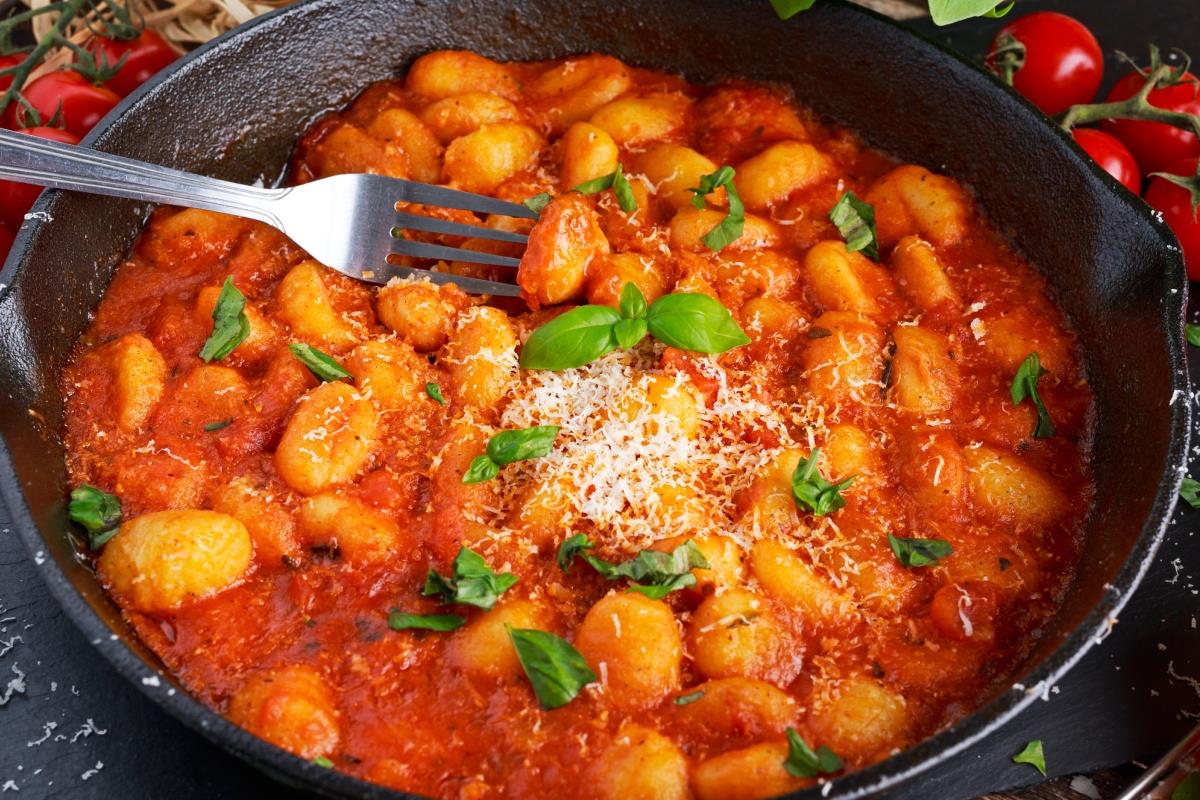 Vratite sve pržene njoke u tavu. Umiješajte umak marinara i pustite da zavrije. Ravnomjerno pospite naribanom mozzarellom.