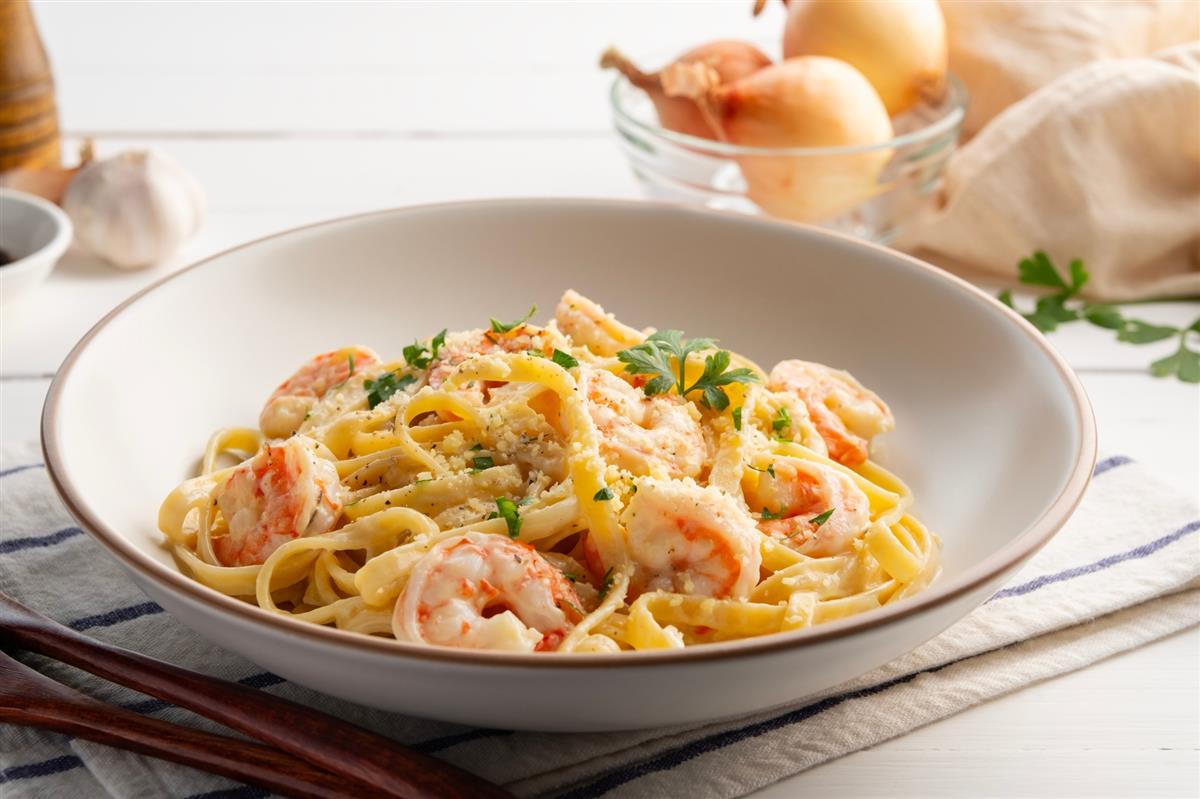 Kad je umak gotov, vratite kozice u tavu, dodajte tjesteninu i malo vode od kuhanja te sve kratko promiješajte. Poslužite toplo, posuto naribanim Pecorinom i po želji svježim peršinom.