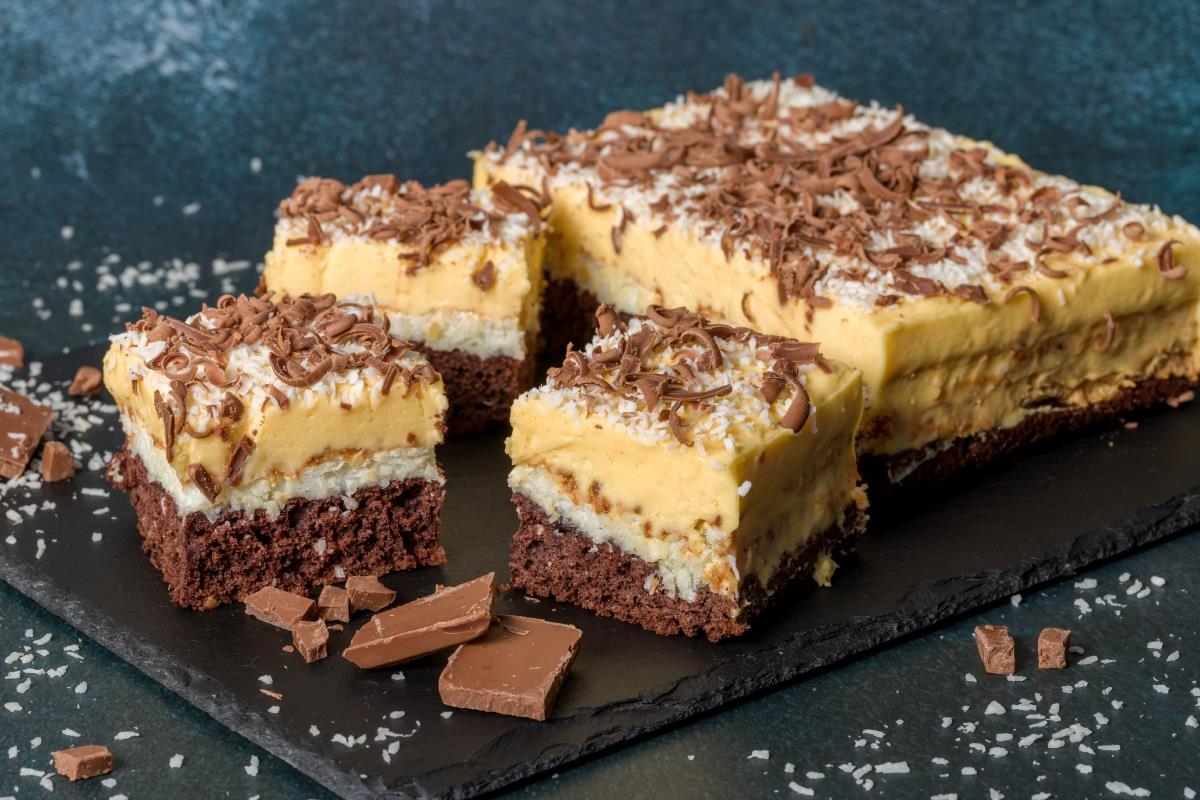 Kolač posipajte naribanom čokoladom i mrvicama kokosa. Ostavite da odstoji barem 4 sata u hladnjaku, idealno preko noći.