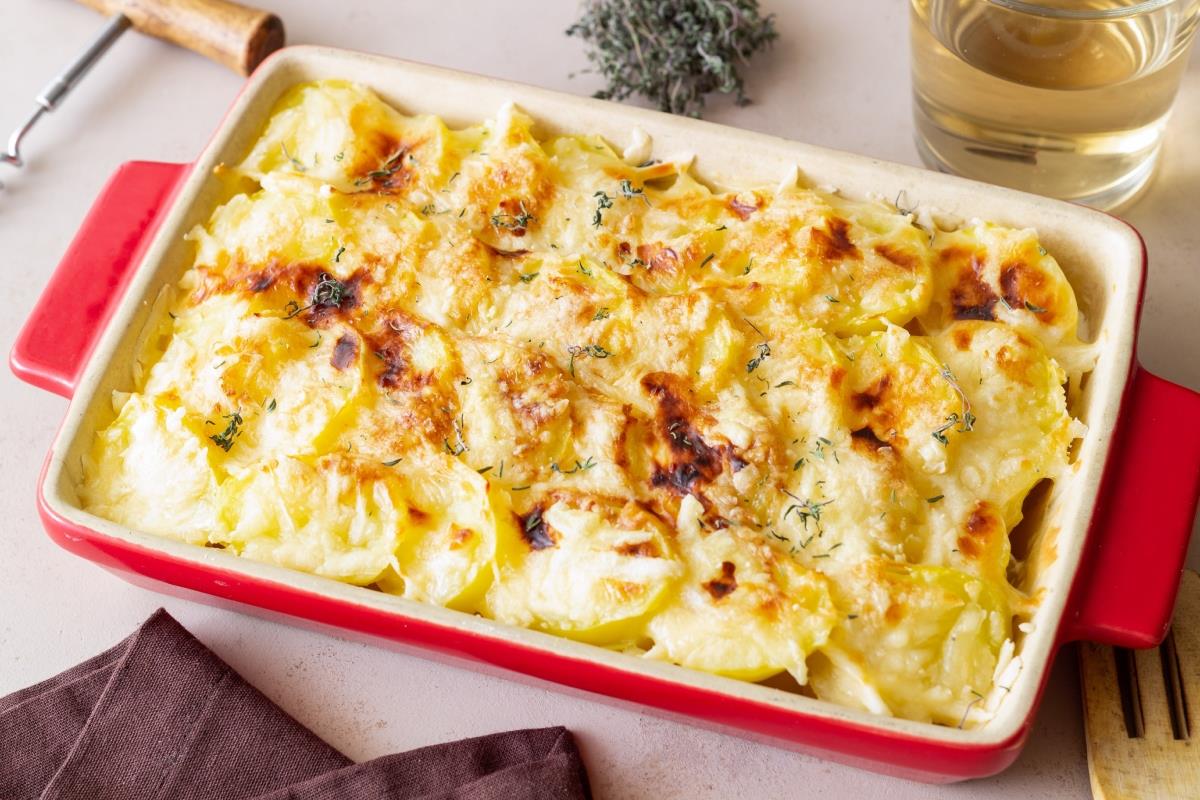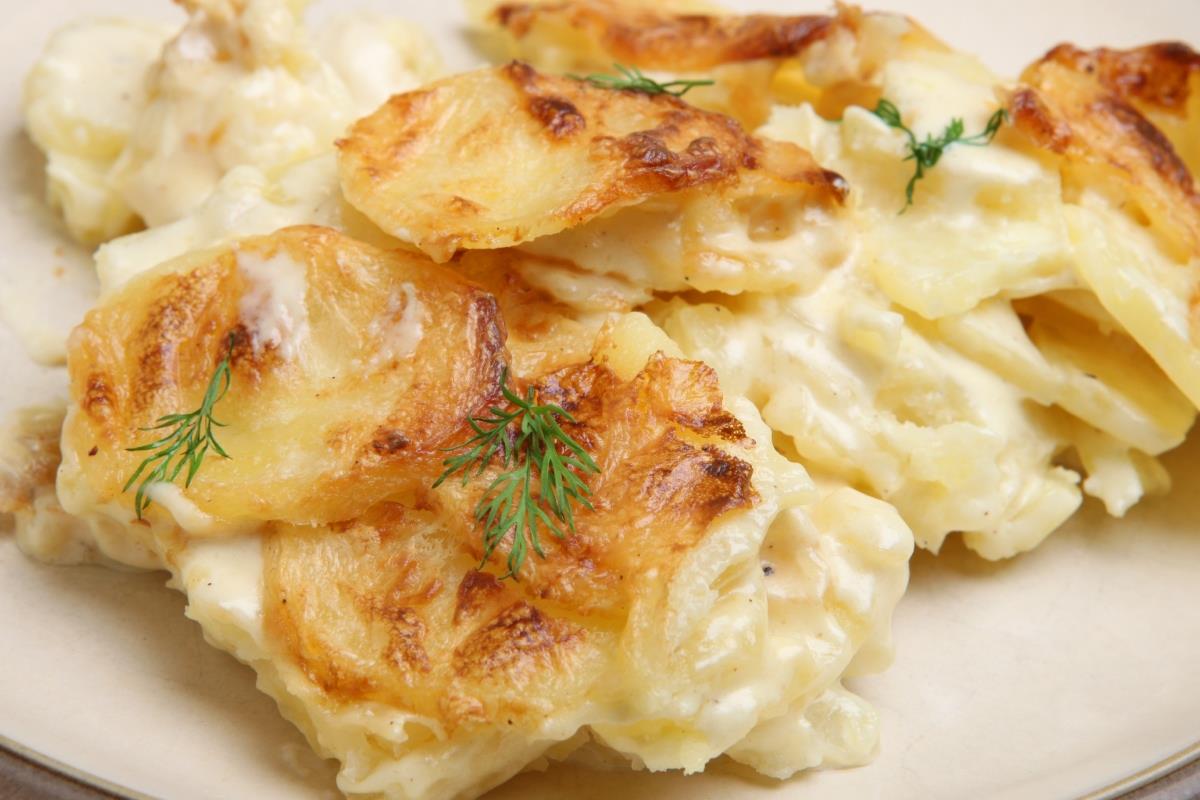 Ogulite krumpir i narežite ga na tanke ploške (oko 2-3 mm debljine). Što su ploške tanje, to će jelo biti kremastije i to će se kraće morati peći (ako su vam ploške deblje, vrijeme pečenja bit će nešto dulje).