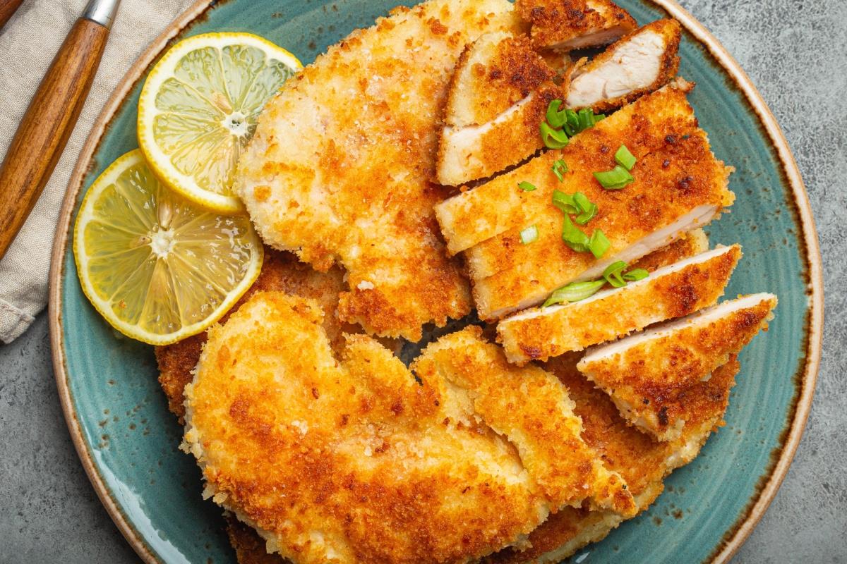 Tavu stavite na srednje jaku vatru. Kad se zagrije, dodajte žlicu maslinova ulja, pa pržite piletinu u mrvicama 3 minute sa svake strane, odnosno dok ne postane hrskava, zlatna i potpuno pečena.