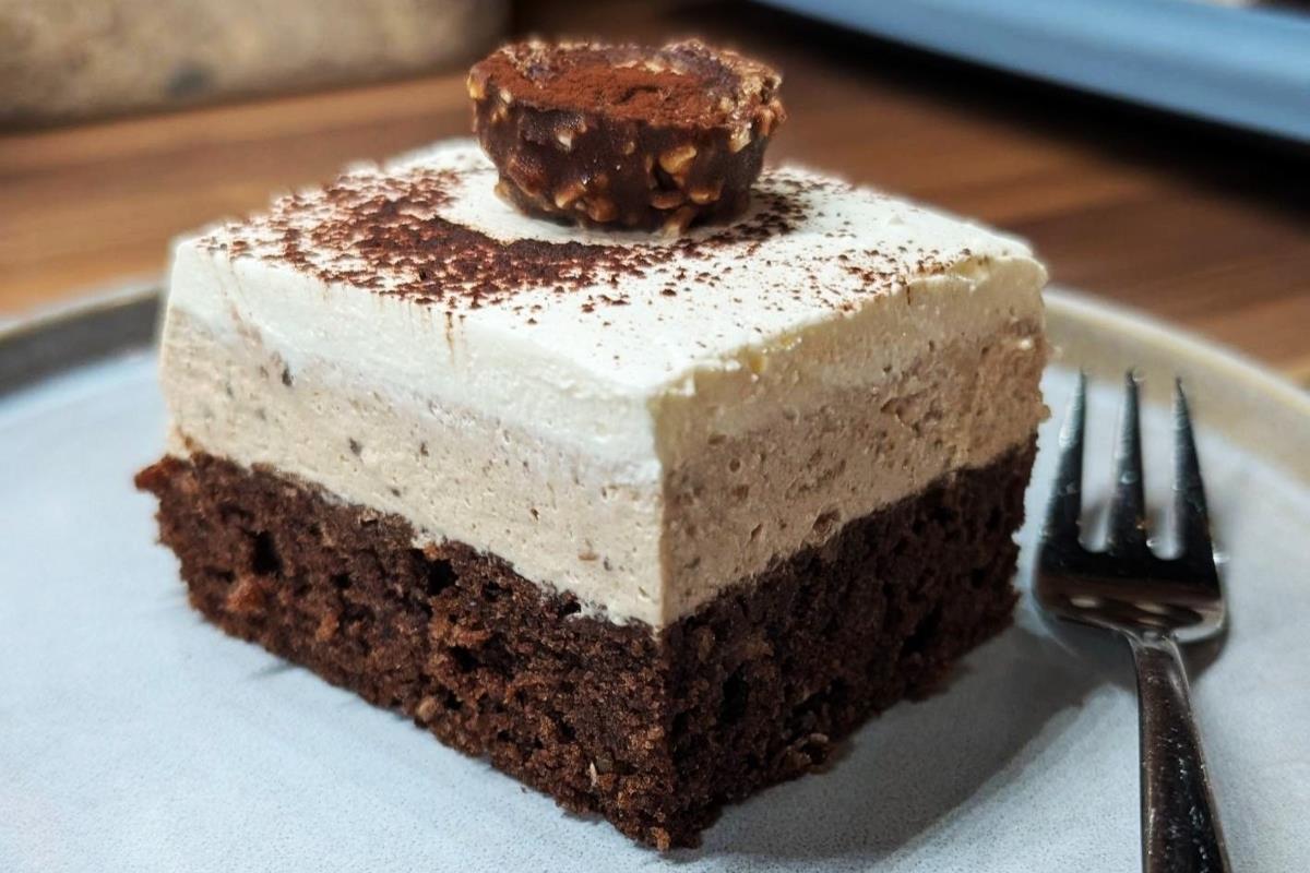 Mikserom izradite mascarpone, slatko vrhnje, bijelu Lino ladu i mljevene lješnjake. Kremu rasporedite preko ohlađenog biskvita.