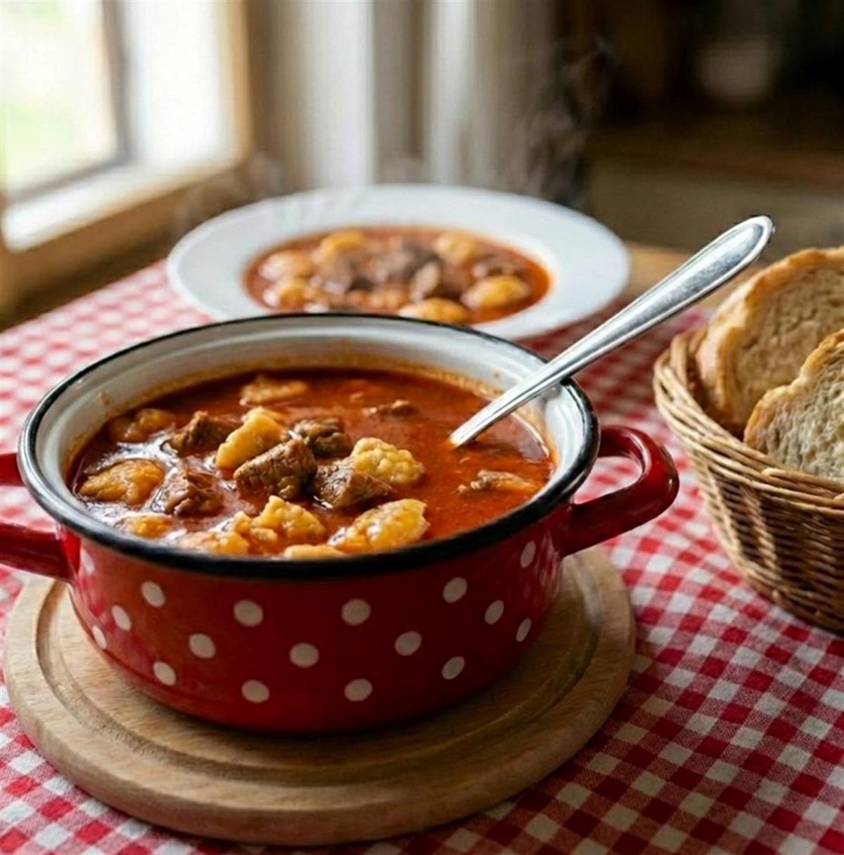 Maknite kotlić kratko s jače vatre ili smanjite vatru na minimum. Umiješajte slatku i ljutu papriku 20-30 sekundi. Odmah ulijte crno vino i promiješajte. Kuhajte 2-3 minute.