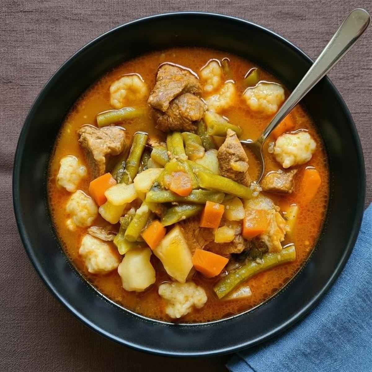 Kad je meso gotovo mekano, dodajte krumpir i kuhajte 10 minuta. Zatim dodajte mahune i kuhajte još 12-15 minuta (smrznute često 10-12 minuta), dok sve ne omekša.