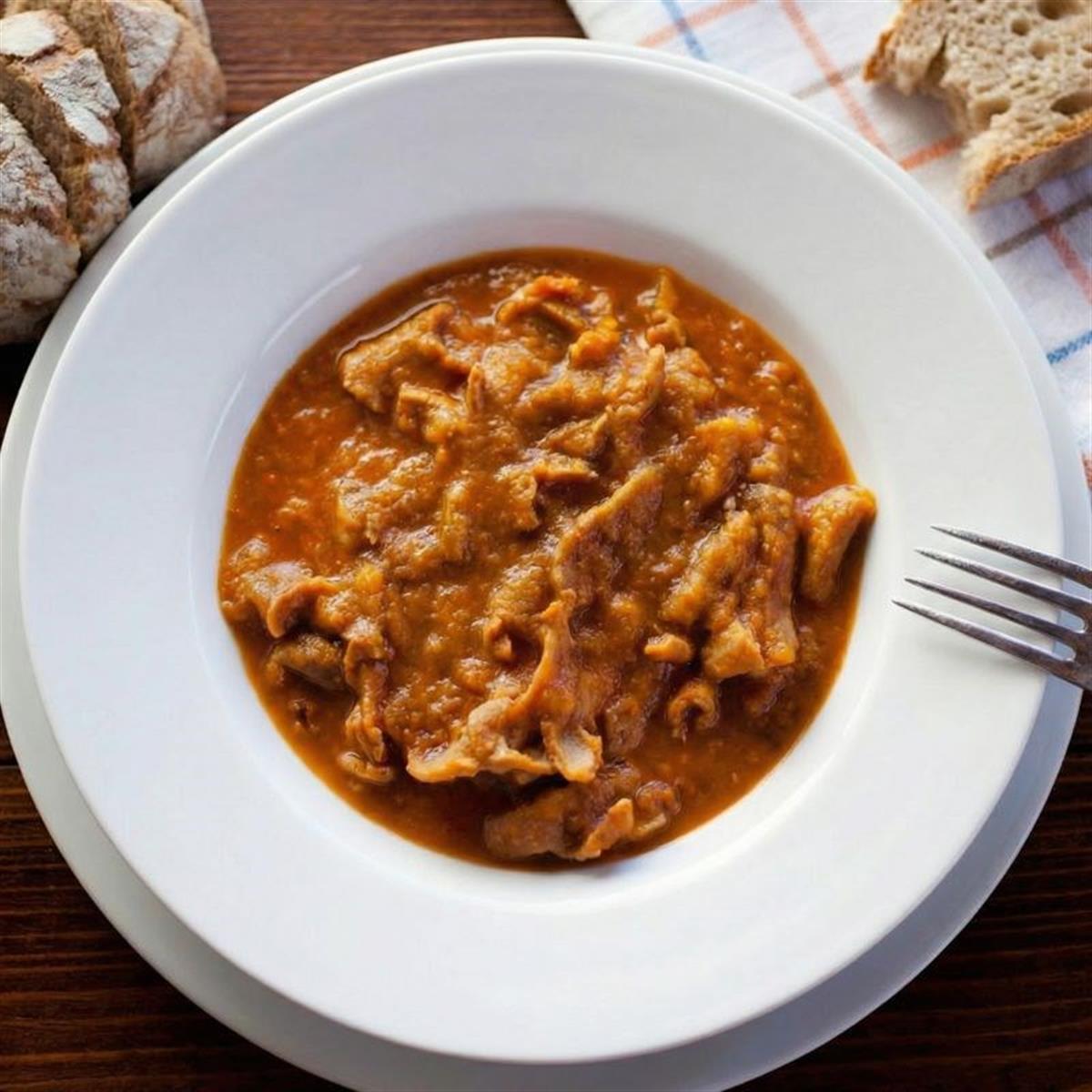 Dodajte tripice i miješajte 2 minute. Ulijte vino i kuhajte 2 minute. Dodajte rajčicu, lovorove listove i temeljac. Kuhajte 60-80 minuta na laganoj vatri, dok tripice ne omekšaju i umak se ne zgusne.
